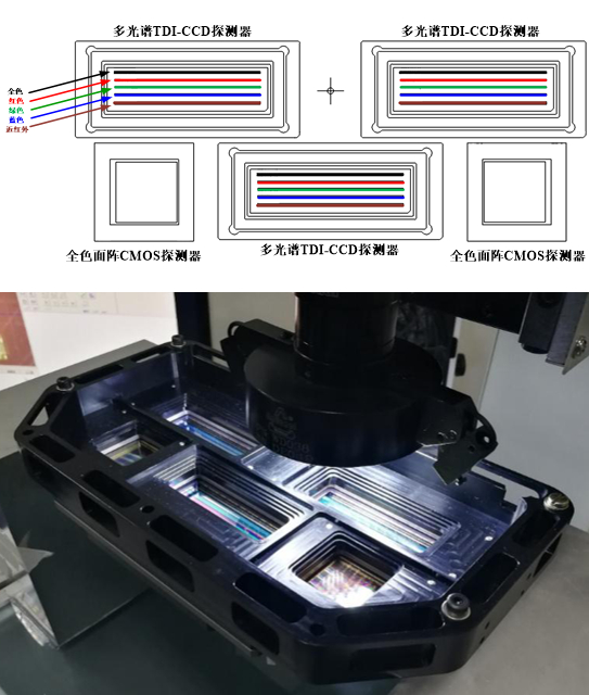 高分辨率相机充分利用2°×0.7°的光学视场,在一个像面上巧妙地设置了两种类型的成像探测器:多光谱TDI-CCD探测器和全色面阵CMOS探测器。3片多光谱TDI-CCD探测器呈“品”字形布局在像面,2片全色面阵CMOS探测器分布在像面两端。