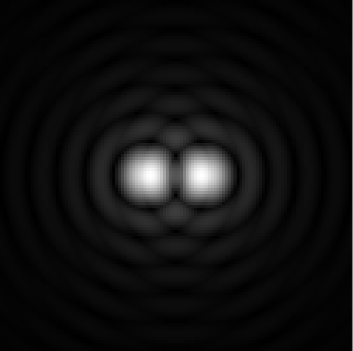 下图仿真计算了具有相同某个焦距与孔径的同轴光学系统与离轴光学系统的分辨能力对比:没有遮拦的离轴光学系统能够很好地分辨出两个圆点(上图);而遮拦比达到40%(例如主反射镜口径为100mm,次发射镜口径为40mm)的同轴光学系统对两个圆点的分辨能力下降(下图)。所以,具有相同光学口径的离轴光学系统比同轴光学系统具有更强的分辨能力。