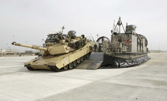 美国海军陆战队的M1A1坦克从气垫登陆艇上驶出。为了适应新的作战概念,美海军陆战队开始淘汰重型坦克,增强机动性和无人作战能力。
