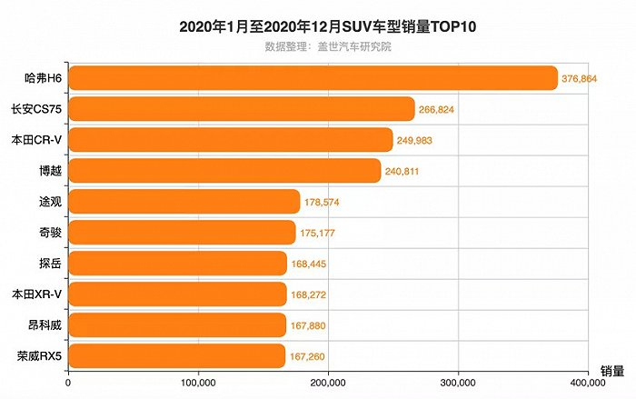 在2020年SUV的销量中,哈弗的H6、长安的CS75、博越等主流自主SUV常年占据SUV销量排行榜半壁江山,但是这些车型的售价,无一不是主要针对15万元以下的中低端SUV细分市场。