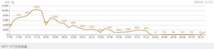 在2018年长城与奔驰签署合作框架到2019年12月底合资工厂开建之前,长城汽车是中国主流车企中,唯一一个没有合资品牌的车企。长城汽车的技术积累主要体现在发动机和变速箱为代表的三大件上,而VV7搭载的便是长城汽车自主研发的三大件。加上具有视觉冲击的外观设计,内饰设计,VV7从2017年4月上市后,迅速获得了市场的认可,销量一路走高,到年底时超过一万辆。
