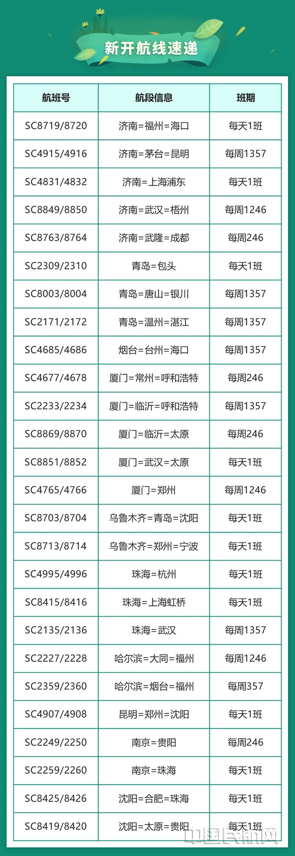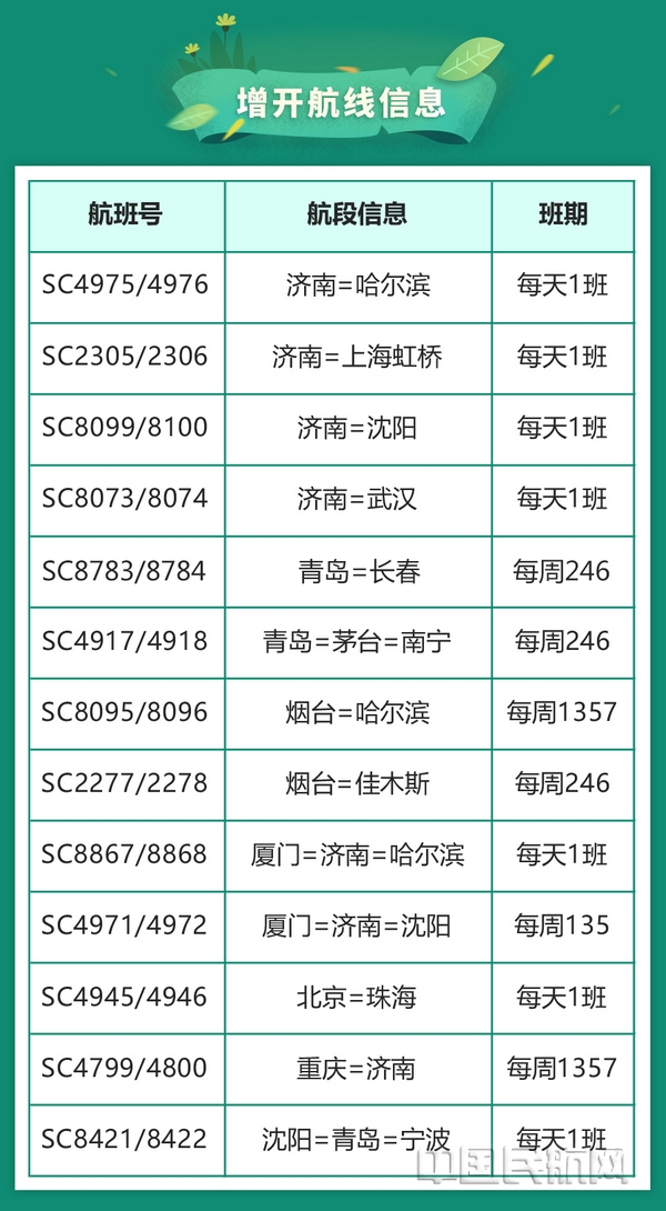 除上述新开航线外,山航还根据旅客出行需求增加了济南—哈尔滨、济南—上海虹桥、济南—沈阳、济南—武汉、青岛—长春、青岛—茅台—南宁、烟台—哈尔滨、烟台—佳木斯、厦门—济南—哈尔滨、厦门—济南—沈阳、北京—珠海、重庆—济南、沈阳—青岛—宁波等13条航线的班次,旅客朋友可根据出行时间选择合适的航班。