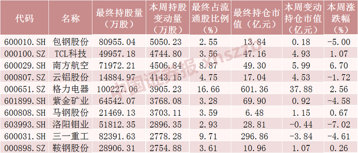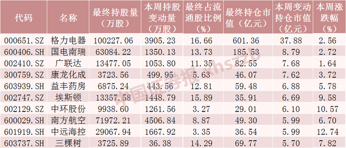 本周北向资金持仓市值增加额前十的个股均被加仓,其中北向资金对格力电器、国电南瑞、广联达、埃斯顿、中环股份、南方航空、中远海控加仓股数超1000万股。
