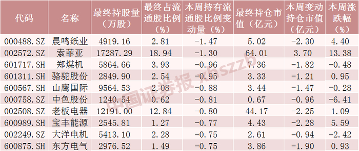 从市场表现上看,本周北向资金持有流通股比例减少前十的个股中,郑煤机、山鹰国际、中色股份、大洋电机下跌,其他6只个股均上涨,索菲亚周涨幅最大,上涨13.38%。