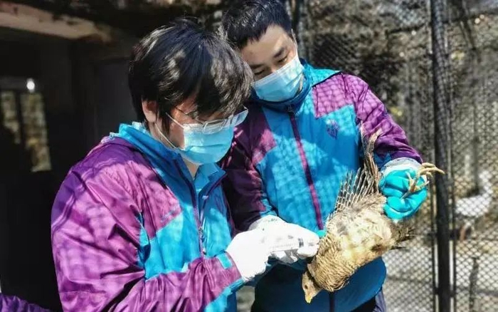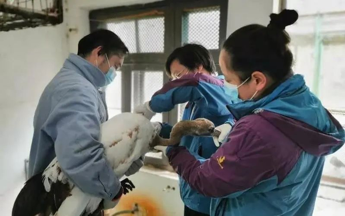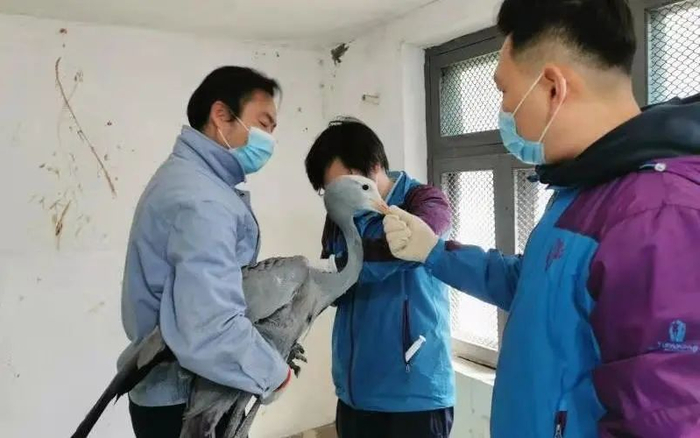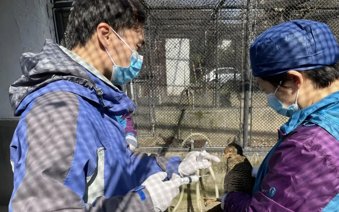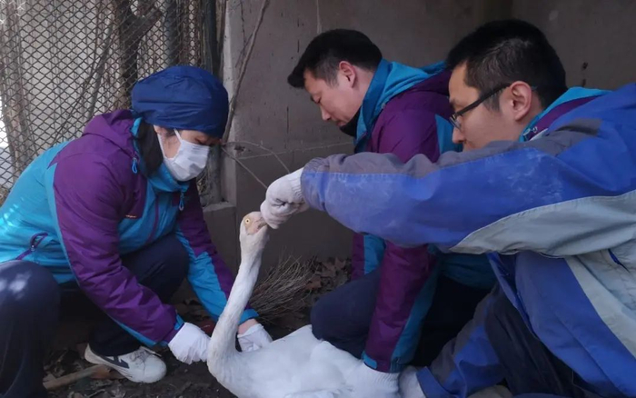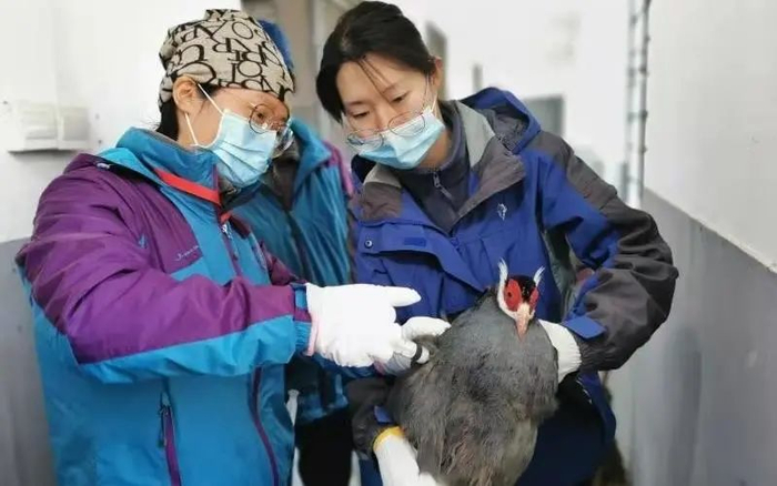 兽医们在采血测定抗体指标的基础上,按照鸟类体重配比相应疫苗计量,对孵化室鹤鹳类包括丹顶鹤、东方白鹳、赤颈鹤、蓝鹤共6羽;雉鸡类包括红腹锦鸡、白冠长尾雉、蓝鹇、白鹇、蓝马鸡共65羽注射了疫苗。