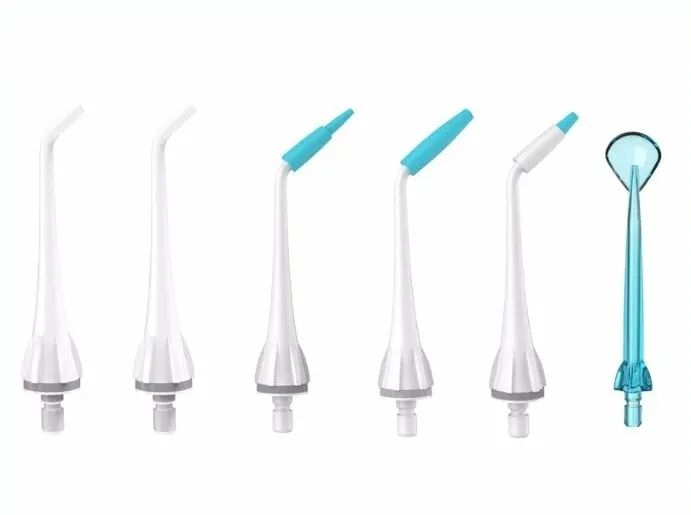 并且冲牙器还配备了6支专业的清洁喷头以及舌苔刷。