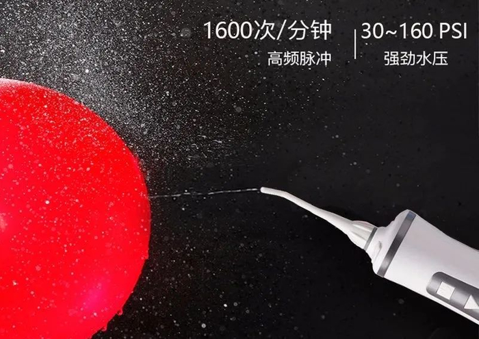 1、1600次/分钟脉冲,0.6mm细腻水柱,高效清洁口腔牙缝,不伤牙龈;