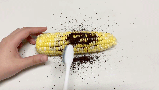 小编试用玉米来模拟牙齿,再抹上一些不易清洁的咖啡粉。