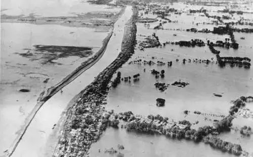为阻止进攻开封和郑州的日军南下,国民党部队炸开黄河花园口大堤,致使豫皖苏3省44县被淹,受灾面积达29000平方公里,冲毁民房140万所、淹没近2000万亩耕地。直接被淹死和饿死的群众多达89万人,390万淮海人民背井离乡,受灾人口总计1000万以上。