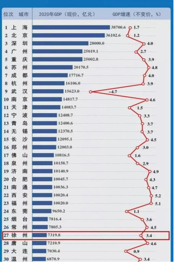 经济上,徐州是GDP区域内最高、全国前30强的城市,在2020年高出第二名临沂两千多亿,可谓一骑绝尘。