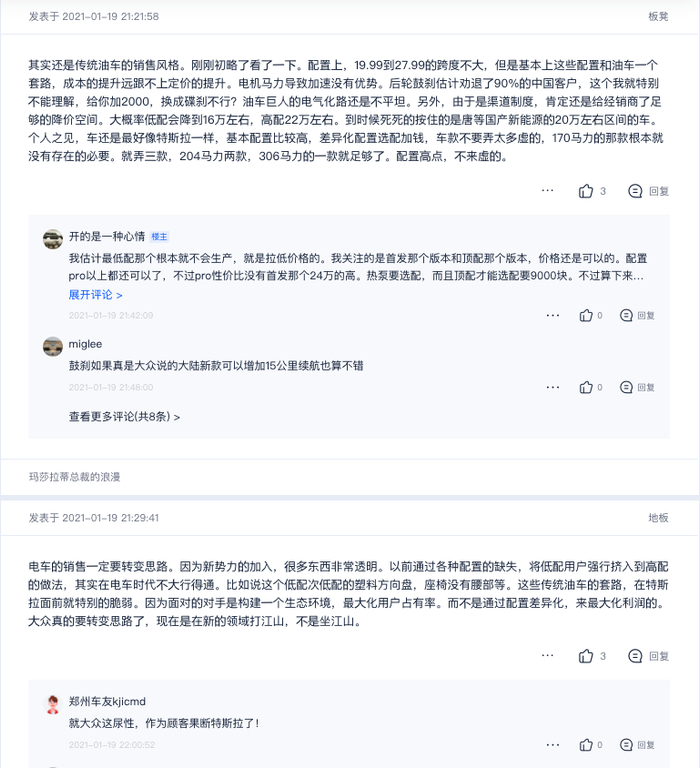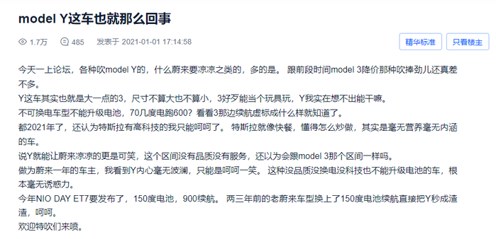 与之对比的是蔚来论坛里除了少数几个大V以外,有大量的KOC用户带动整个论坛频繁互动,且互动态度普遍正面。特别是特斯拉Mode Y上市后,大量蔚来用户表示Model Y性价比仍不如蔚来车型,引发各路网友的热烈讨论。