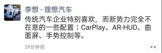 最近理想汽车CEO李想也在朋友圈表示,像CarPlay、AR-HUD、曲面屏、手势控制一类的配置是新势力完全不在意的一些东西,而传统汽车企业却特别喜欢强调。消费者对ID.4的HUD不感冒从侧面印证了这一观点。