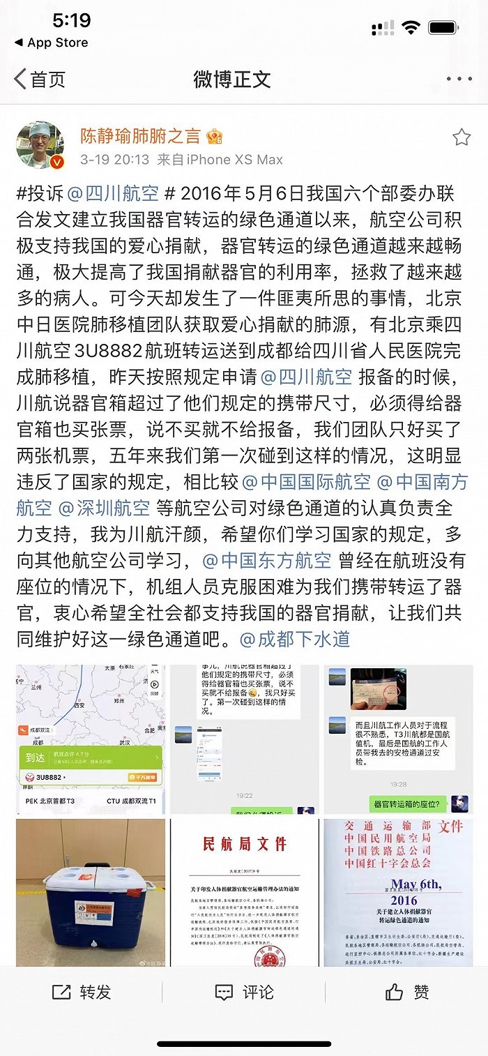 3月19日,认证为无锡市人民医院副院长的@陈静瑜肺腑之言发布微博,针对川航对人体捐钱器官收取运输费一事表示质疑。