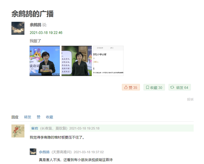 如果仅仅止于张冠李戴的讹传倒也无伤大雅,所牵涉的仅是一古一今两人而已。然而,讹传带来的影响是,这首诗不仅入选了大量少年儿童诗词读本,甚至被冠以“小学必背”进入各种音视频课程加以贩售。考证发帖者“余鹧鸪”直呼:“被灌输这样的‘诗’,将它当作优秀的作品来背诵,小朋友何其可怜!”