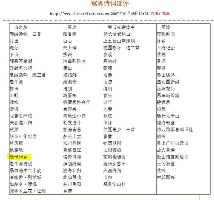 中国作家网《寓真诗词选评》目录中的《送母回乡》。