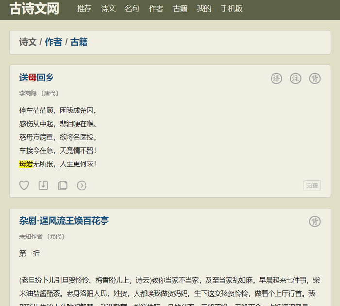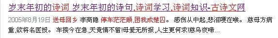 在搜索引擎输入“送母回乡”则自动联想“送母回乡 李商隐”,甚至被古诗文网收录。