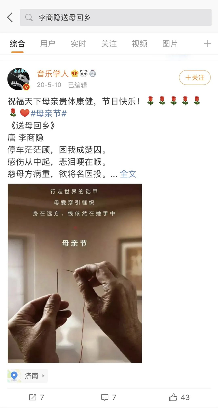 在亲子、幼教、诗词国学等各类公众号上,不仅单纯署上了李商隐的大名,还煞有介事的增加了赏析、背景介绍,诸如“武宗会昌二年(842年),李商隐重入秘书省不到一年,母亲去世,遵循管理,李商隐必须离职回家守孝三年……这首诗抒发了李商隐对逝母的怀念和懊悔”,愈发显得可信。每当母亲节之时,“李商隐的《送母回乡》”就频频出现于各种文章和网友文案当中。