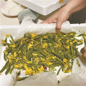 工作人员正在挑选黄瓜花。