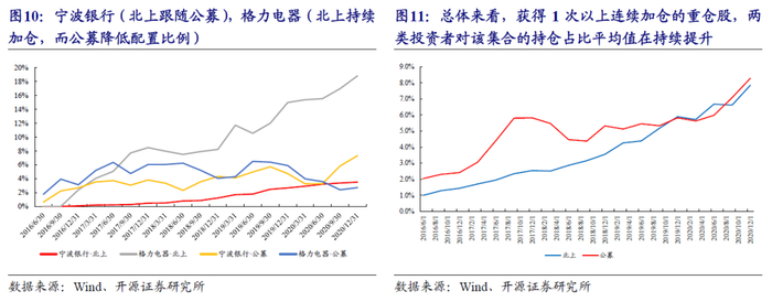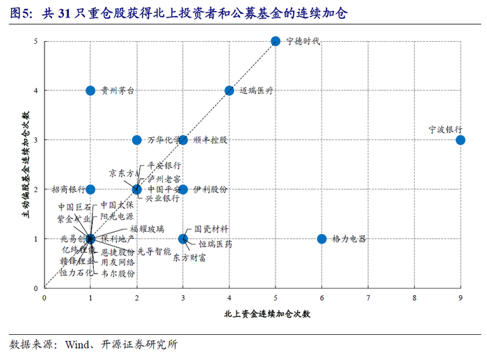 除了两类投资者在更广泛的标的上形成了共识,我们还发现两类投资者对一些形成了共识的个股「认同感」也在不断加深,最终的表现就是对它们的持仓持续增多。