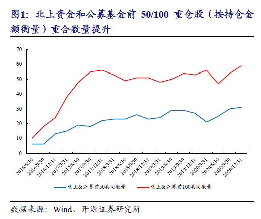 具体表现为:北上资金和公募基金前50/100重仓股 的重合度越来越高,为排除单纯由于股票涨幅所带来的影响(也就是涨得越多的股票由于金额增大更容易跻身前50/100重仓股),我们按照持仓股本占某只个股流通股本的比例来排序,也同样会发现两类投资者持仓中排名靠前的股票重合度越来越高。