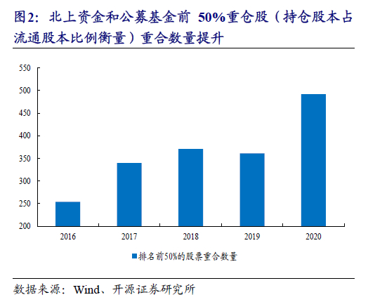 第二段(2019年至2020Q3)由于北上源源不断的做多力量支持,导致了其中部分公募基金业绩突出,其投资理念被广泛接受,越来越多投资标的被更多公募基金广泛接受,「抄作业」开始逐步盛行。