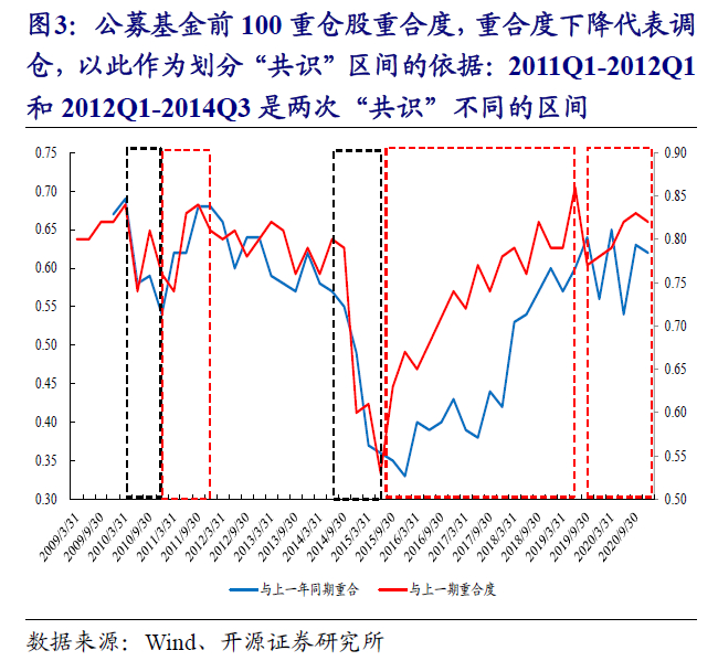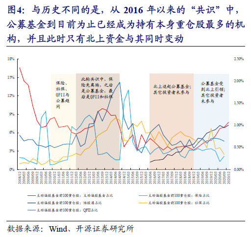 值得重视的是:从2020Q3开始,公募基金持有自身重仓股的比例已经高于其他类型的投资者,这在历史上从未出现:历史上前两次共识形成期中,在公募基金持有自身重仓股比例较高时,其他类型的投资者也会加入「共识」并快速加仓,而公募基金则开始调仓,准备下一次「共识」。