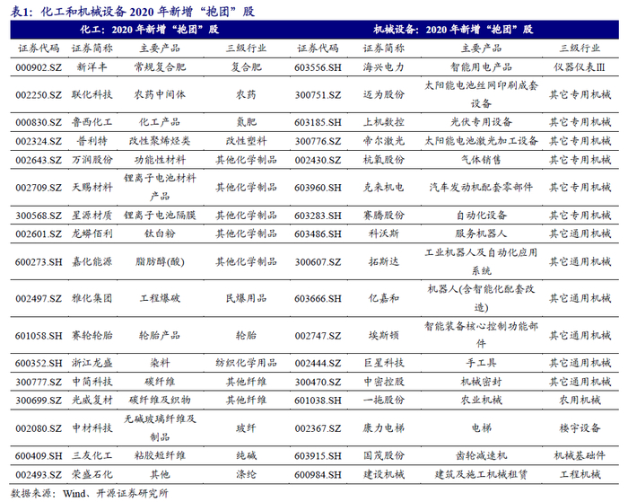 化工行业中,相较于2019年增加的「抱团股」分布于新材料、化纤、农化产品中;机械设备行业中,相较于2019年增加的「抱团股」主要分布于专用机械(锂电池、光伏、半导体、油气、纺织)、通用机械(工业机器人)。