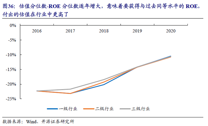 在图9-图11中能够发现,2016-2017年和2019-2020年,在市场整体向上时,ROE平均值和稳定性的分位数都增大,在火热的市场氛围中投资者不会过多在意估值扩张是否偏离了锚,而当市场没那么好时,又需要重新去寻找估值的锚——ROE,例如2018年。