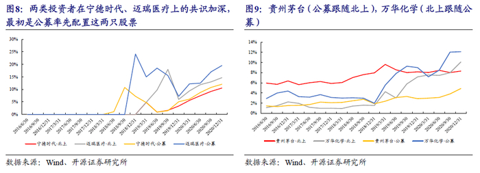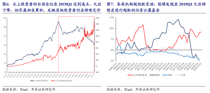 从个股上能发现一些有意思的现象:尽管对贵州茅台似乎是公募基金加仓次数更多,但实际上北上投资者持有贵州茅台的比例始终高于公募基金(图8),而在白酒板块上的仓位也是从2019Q1开始降低,但同时浮盈却在公募的持续买入下累积(图5),这进一步说明了北上投资者对于白酒板块加仓得更早,公募基金扮演了「跟随者」的角色。