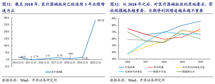 我们对此做的猜想是:中药本身不具备类似于其他医药生物细分领域的技术迭代和产品创新,而是品牌效应构建出壁垒,此时营收的意义大于研发管线;而研发管线一旦成功上市,则表现出的是当期更大的业绩弹性,因此在中药在2018年业绩负增长之后,市场的研究和选择标准就改变方向,一方面:要求中药板块本身重新回到不断验证业绩的阶段,再次积累基本面的共识信号,另一方面,转向了更看重研发的化学制药和医疗器械领域,进而表现为当期净利润增速要求较高。从中药的例子,我们可以发现「共识」容易在业绩证伪时瓦解。