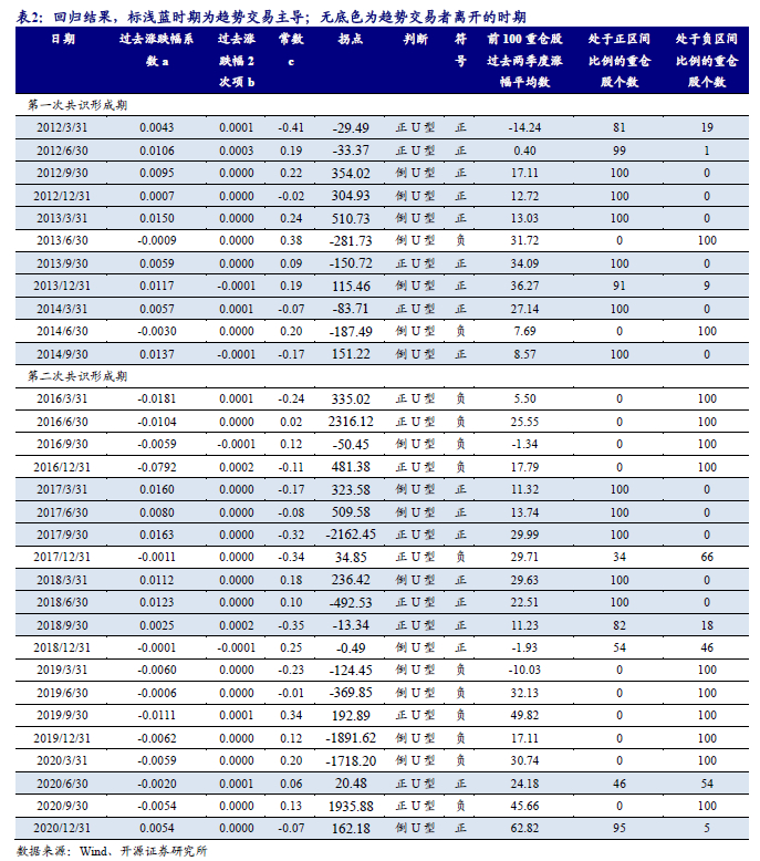 其中系数a和系数b以及前推两季度涨跌幅如下表,在2012Q1-2014Q3和2016Q1-2020Q4这两次较长时间的共识期中,均会出现趋势交易的痕迹。趋势交易的加入会让市场进入正反馈:表现为股票前期涨幅越高,加仓越多,或者前期跌幅越高,越是卖出(公式描述为:(a+b*chg)>0)。而趋势交易行为不占主导往往意味着负反馈的出现:股票前期涨幅越多,减仓越多,或者前期跌幅越高,越出现买入(公式描述为:(a+b*chg)<0)。无疑,2020Q4个股增减持与过去2个季度涨跌幅之间出现了明显的正向关系,这放大了市场的波动。