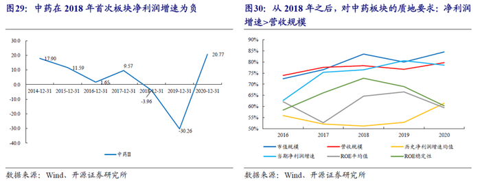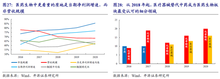 拆分得更细来看,医药生物中被抱团的二级行业变化:中药、化学制药(2016年)→化学制药、中药(2017年)→化学制药、医疗器械(2018、2019、2020年),能够发现自2018年中药这一细分领域不再受到此前那么多的青睐之后,对医药生物行业中股票的营收要求也随之降低。