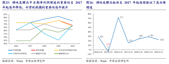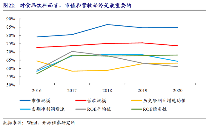 以食品饮料中的白酒为例,经历了2018、2019年两年的业绩增速下滑,市场对当期净利润增速(预期)的要求也在2019年提升,进入2020年后可能由于新冠疫情的原因无法期待当期的高增速,于是转而开始重视历史净利润增速,此前重视的营收规模指标重要性下降。调味发酵品也存在同样的规律:2020年业绩净利润增速下滑,于是当期净利润增速(预期)这一指标的重要性立刻提升,而其余几乎所有指标重要性下降。