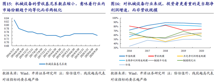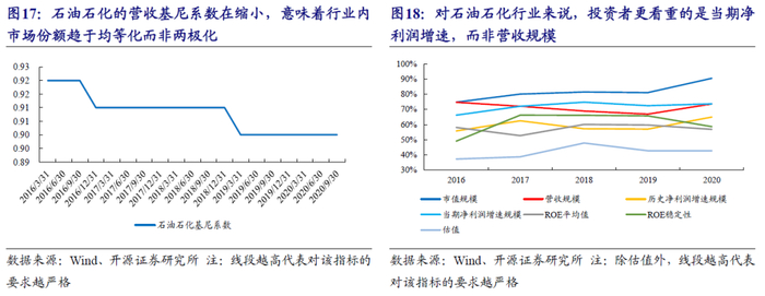 而要求大营收则是在存量经济下一条广受认可的「集中度提升」的逻辑,即头部公司会逐渐挤占尾部公司的份额,我们也确实发现大多数行业在2016-2020年都发生了集中度提升的现象(除机械设备、石油石化、钢铁、国防军工以外):我们再按照上述方法计算当期净利润增速(分析师预期),营收规模、历史净利润增速、ROE稳定性、ROE平均值这几个指标,对比能够发现在上述几个未发生集中度提升的行业中,营收并非首要考虑。
