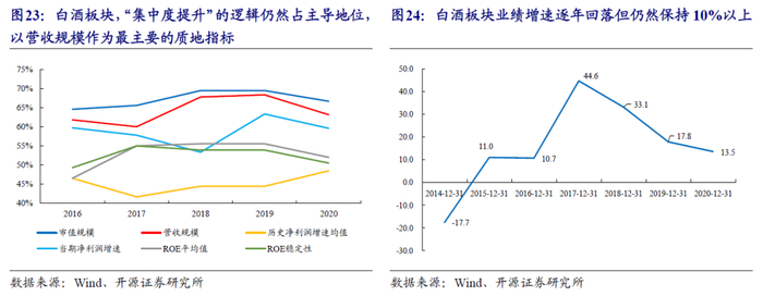 食品饮料中的细分领域更迭也可以验证上文阐述的假说:最初主要以白酒作为被抱团的代表,后续逐渐扩散到食品综合、调味发酵品。白酒的业绩增速在2017年达到顶点,其后逐年回落,但始终保持在10%以上的增速,因此「集中度提升」的逻辑仍然占主导地位,以营收规模作为最主要的质地指标;调味发酵品从2017至2019年业绩增速持续上行,在此过程中对当期净利润增速的要求放松,而对营收规模的要求上升。
