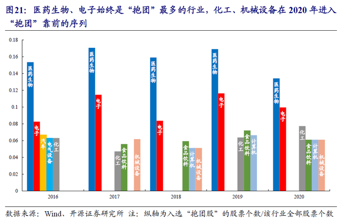 医药生物、电子是「抱团」最稳定的行业,和直觉相符合的是食品饮料从2017年开始被稳定抱团。从2020年相对于2019年的变化来看,后起之秀是化工、机械设备:化工超越了食品饮料、计算机成为排名第三的抱团行业,而机械设备则一跃而起与食品饮料、计算机共同排名第四。