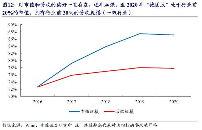 除了我们此前提到的「以大为美」来源于研究资源集中化和机构头部化所形成的循环,对市值的看重还可能来源于机构资金配置时需要考虑的流动性问题,要求市值必须保持在某一个基准以上,随着机构的头部化,这种对市值要求的阈值也需要随之提升。