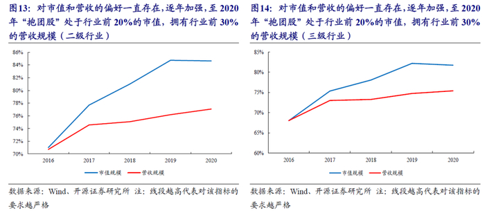 「龙头白马」行情中最直观的财务特征就是被认为是「龙头」的股票具有在行业中排名靠前的大市值和大营收,从历史的变化我们可以看到这种偏好是如何形成的。