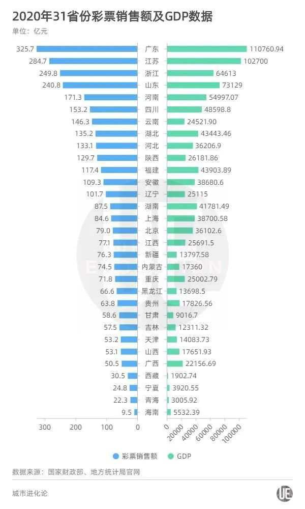 以今年初广东省福彩中心提供的数据,广东全年共销售福彩162.1亿元,筹集福彩公益金50.1亿元,筹集率达30.9%,总销量和公益金筹集量均排名全国第一,这已经是广东连续13年蝉联全国福彩销量冠军。而在体彩方面,2020年江苏的彩票销量更胜一筹。