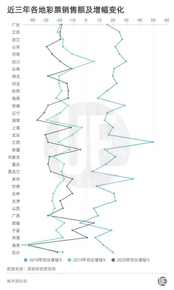 但最近两年,各地彩票年销售额同比增幅,却多“镜像”变为-20%左右;2019年,仅四川一省同比正增长;2020年,则只有西藏和青海两地,同比增幅在零线以上。