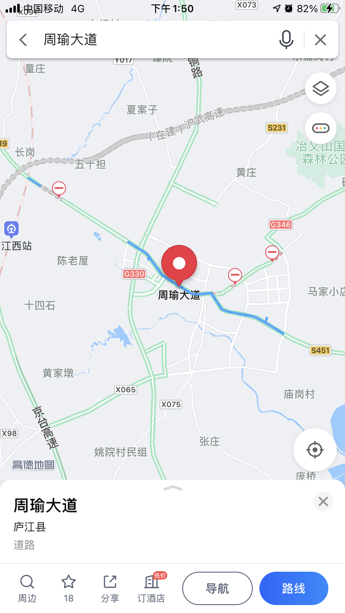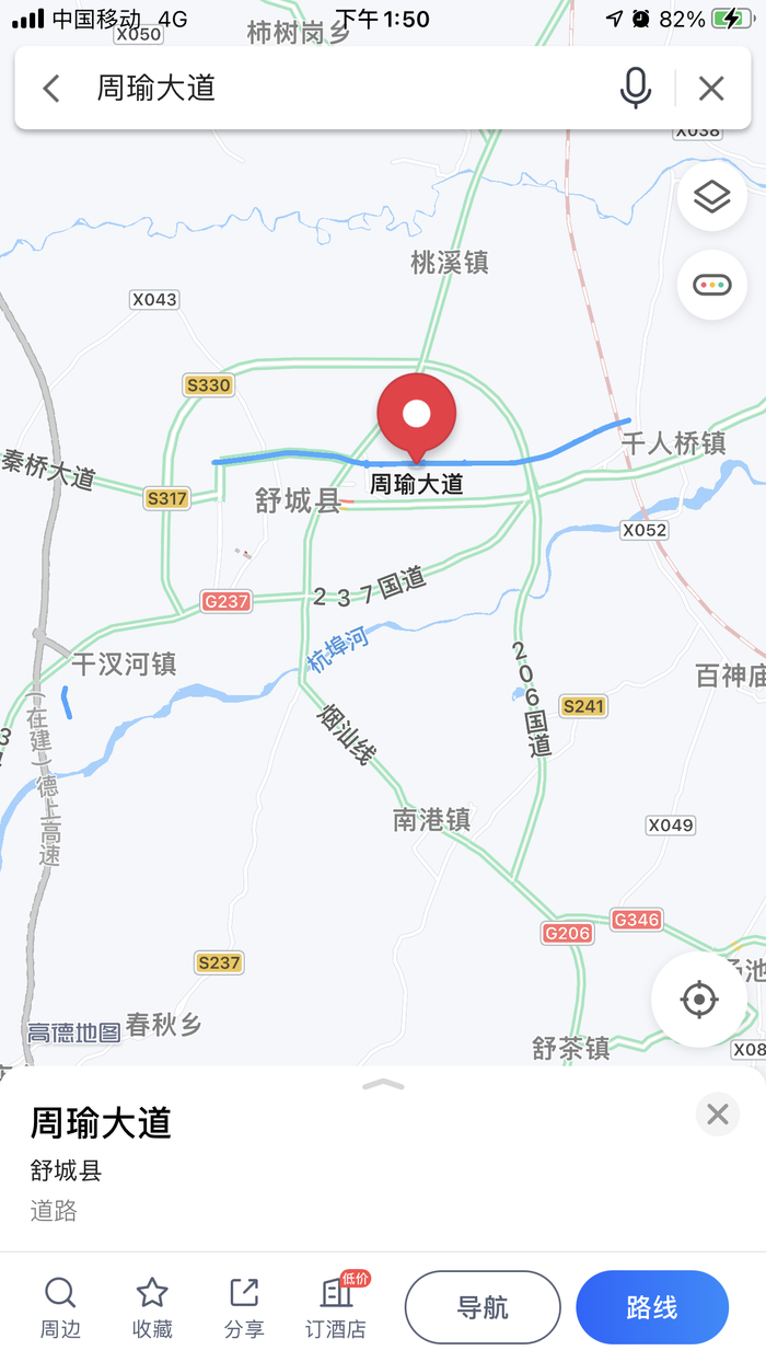 3月21日,澎湃新闻记者通过多个手机地图导航软件查询发现,搜索“周瑜大道”会同时显示舒城县和庐江县的上述两条道路,若不详加区分,极易混淆。