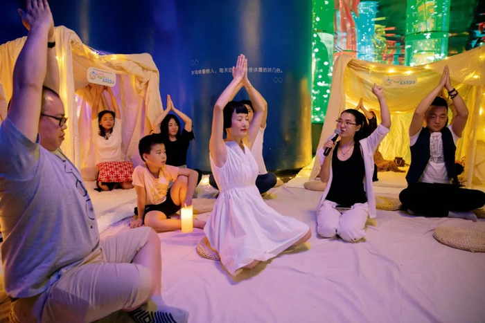 2018年9月21日,深圳欢乐海岸海洋奇梦馆内的一场“晚安治愈馆”活动中,人们通过冥想等环节,释放负面情绪和压力。图/视觉中国