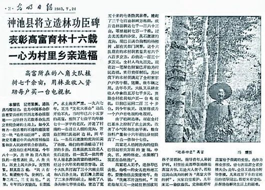 有一年在吕梁山区,一位教书几十年的山区教师默默无闻,我建议县委授予他“山区办学英雄”,然后见报。我当时对自己的职业要求是:“为无名者立传,为隐身者传名”。这一次神池县委也接受了我的建议为高富立碑。常委会一通过决定,我即发了这篇新闻稿《(肩题)神池县将立造林功臣碑;(主题)表彰高富育林十六载,一心为村里乡亲造福》。《光明日报》1983年7月24日见报。