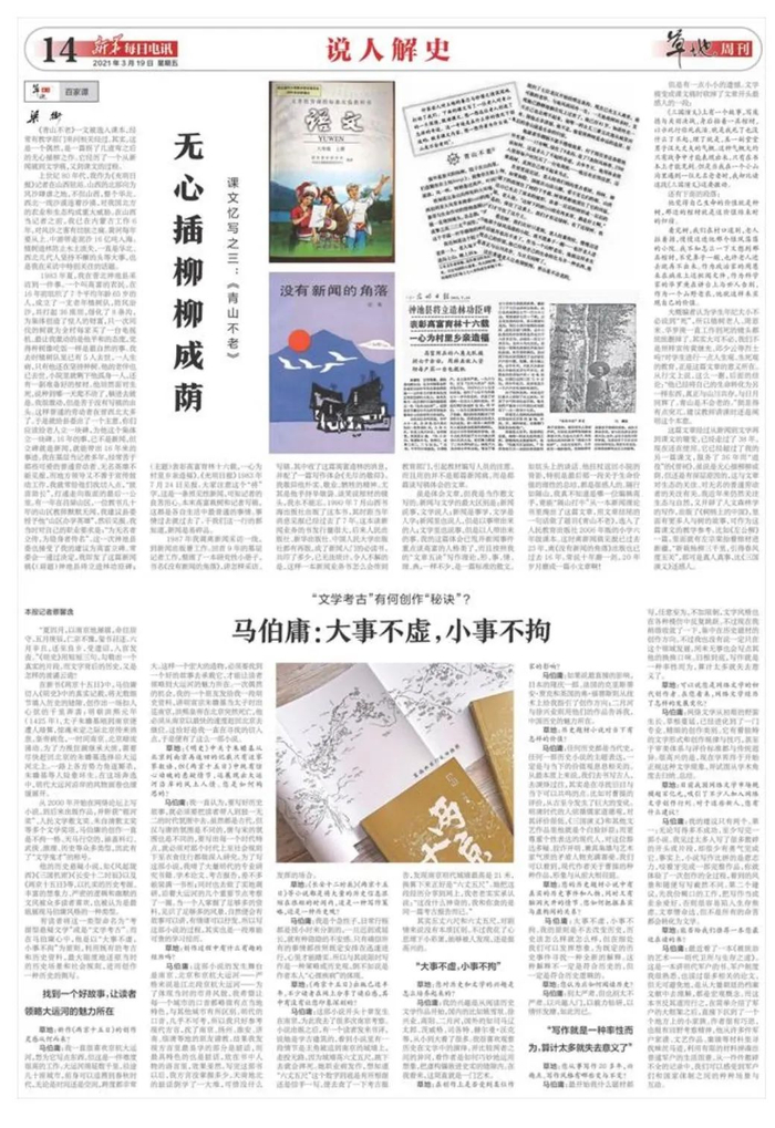 《青山不老》一文被选入课本,经常有教学部门来问相关经过。其实,这是一个偶然,是一篇拐了几道弯之后的无心插柳之作。它经历了一个从新闻稿到文学稿,又到课文的过程。