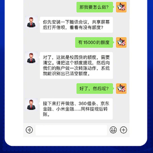 在“备用金退款”骗局中,骗子通过黑色产业链掌握了受害人的部分个人信息和物流信息,主要利用受害人想要获得退款的心情,与对“备用金”的不了解进行诈骗。在受害者初步上钩后,骗子还会要求加受害者的QQ等,通过屏幕共享的方式窃取用户的验证码、密码等,甚至让用户用借呗提现后转账给骗子。