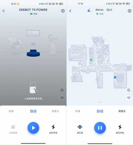 任何无线电子产品,续航都是一个无法逃避的痛点,而扫地机器人由于极大的能量小号,也就对续航提出了更大的挑战。DEEBOT T9内置了5200毫安时的电池,实际清扫测试中,在2档吸力和同步开启擦地模式的条件下,实际清扫面积约为32㎡,扫地机器人电量从80%件到了51%。据此推测满电状态应该可以完成实际清扫面积约100㎡、房屋总面积约250㎡的大户型的清扫任务。