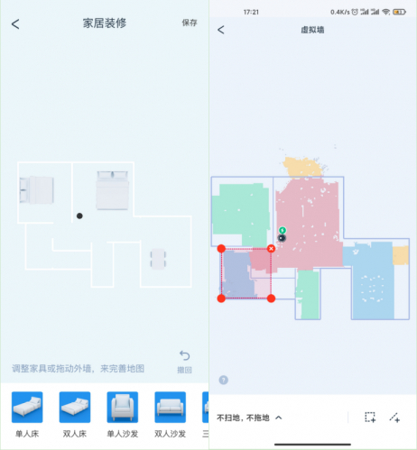 同时它里面还有一个地图绘制功能,地图能够放大,缩小,能够编辑添加家具。能够给扫地机器人画出不用清扫禁区或者是划定虚拟墙,用起来还是非常方便的。