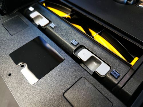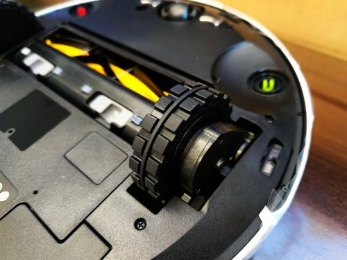 接下来看一下它的底部,底部的两边是两个大边刷,中部为集尘盒入口,两侧为两个驱动轮。