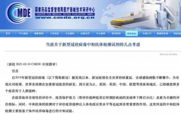 2月18日,国家药监局医疗器械技术审评中心(下称“器审中心”)发布《当前关于新型冠状病毒中和抗体检测试剂的几点考虑》(下称《考虑》)。在调研疫苗研发、疫苗评价、中和抗体试验研究和评价、临床医生等领域的专家观点后,对于体外诊断试剂能否进行中和抗体检测,能否用于疫苗效果评价等相关问题做出回应。
