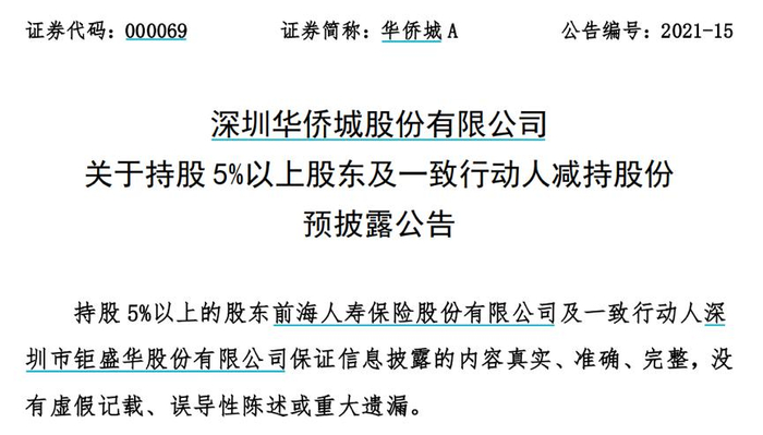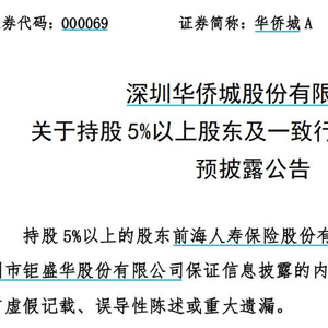 3月19日晚间,华侨城A发布减持股份预披露公告,合计持有公司8.98%股份的股东前海人寿及一致行动人深圳市钜盛华股份,计划6个月内以集中竞价方式减持不超过公司总股本的2%。